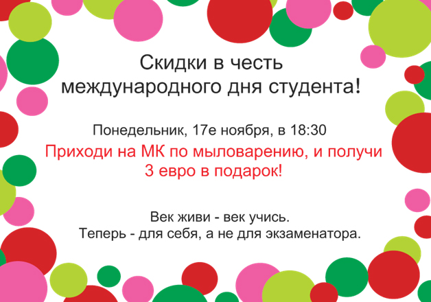 Век живи — век учись! Опубликовано 12.11.2014 - ORANGEвое настроение Для тех, кто уже работает, но хочет вспомнить веселые студенческие годы. В честь Международного дня студента на мастер-класс 17.11 (мыловарение) — скидка 3 евро!